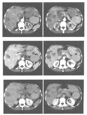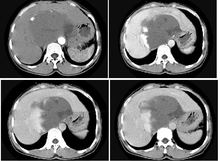 患者,男,50岁,右上腹痛伴黄疸,超声体检发现腹腔多个液性暗区。CT图像如下,最可能的诊断是()