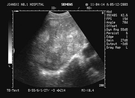 8、单项选择题 男,37岁,既往有肝炎史,超声发现脾脏显著肿大,肝表面不光滑,肝实质回声不均匀。右肝可见3cm的圆形病变,边缘整齐光滑,有弱回声晕,内部为均匀低回声,诊断最可能是()