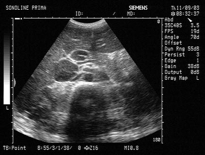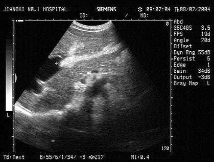男,60岁,上腹疼痛不适数10年。结合超声声像图,诊断为()