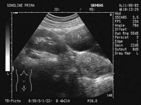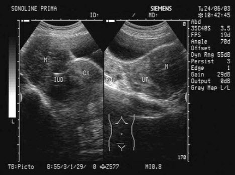 女,已放置节育器;腹痛,镜下血尿,超声显像如图,最可能的诊断为()