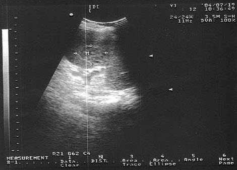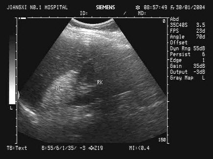 某患者无明显不适,根据其肝右叶-右肾区超声声像图,最可能的诊断为()