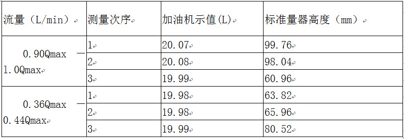 已知标准器检定证书注明:66.65mm刻度处容量为20.00L,计量颈分度容量V颈=1.95mL/mm。对加油机进行自校,其数据如下,试判断该加油机本次自校是否合格。(不考虑温度的影响)