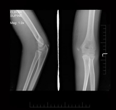男,8岁。跌倒时手掌着地,查体:肘部明显肿胀,有压痛,肘关节呈半屈曲状向外突出畸形,肘后三角尚存。