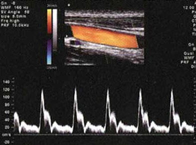 ②CDFI:扩张的眼上静脉呈红色血流或五彩镶嵌样血流