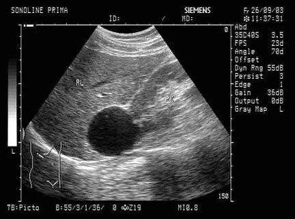 男,60岁,胆囊结石病史多年,脾大小正常,有疫区接触史。结合超声声像图,诊断为()