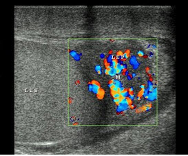 男性,右侧阴囊空虚,左侧可触及,于腹腔见一个椭圆形低回声光团,边界清晰,回声尚均匀,CDFI:血流信号丰富。如图所示,考虑为()