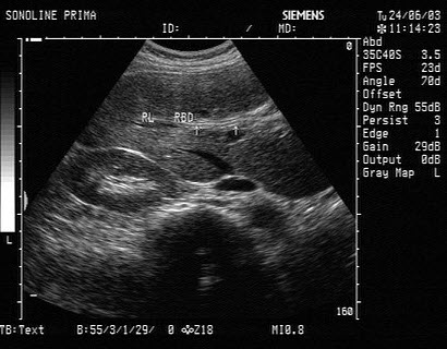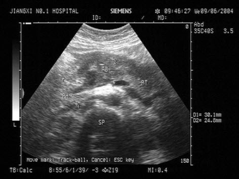 女,34岁,经常反复发作剧烈的右上腹痛,加重1天。声像图如图所示,最可能的诊断为()