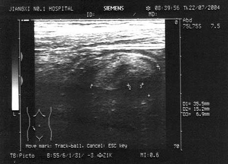患者,女性,29岁,右下腹持续性剧痛数小时,伴恶心、呕吐。PE:右下腹饱满,可扪及一压痛性包块,边界不清;WBC:18×10/L,尿HCG(Ⅲ),麦氏点压痛,反跳痛(+)。结合超声声像图,最可能的诊断为()