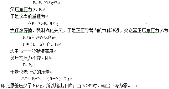 图示为乙烯装置脱甲烷塔底液面差压测量系统。其中正压导管用蒸汽伴热,以强制导管中的介质气化。塔内的压力为P。介质密度为ρ,液位变化高度为H,问变送器的量程为多少?若伴热蒸汽停用,则变送器的输出会发生什么变化?