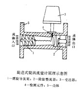 ②它的工作原理如图所示,当流体进入测量管后,通过螺旋导流架1后,形成一股具有旋进中心的涡流。随后随着测量管内腔的收缩,使涡流的前进速度和涡旋速度都逐渐加强,在此区域内的流体中心是一束速度很高的旋涡流,沿着测量管的中心线运动。到热敏电阻时,由于测量管内腔突然扩大,流速急剧减少,一部分流体形成回流,于是流体不沿着测量管内腔中心线运动,而是围绕中心线旋转,即所谓旋进。旋进频率与流速成正比,因而测得旋涡流的旋进频率即可得知被测流量值。