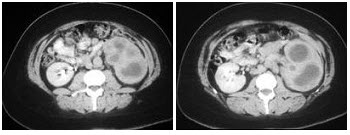 299、单项选择题 青年女性,低热、乏力、左腰痛3月余。CT示左肾影增大,左肾上极密度不均,有斑点样钙化,增强扫描左肾上极有多个囊腔,囊壁中等强度环形强化,邻近肾实质受压变薄,肾盏轻度扩大,应首先考虑左肾上极病变为()