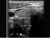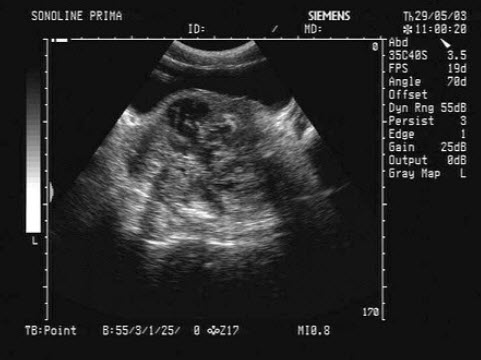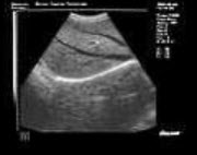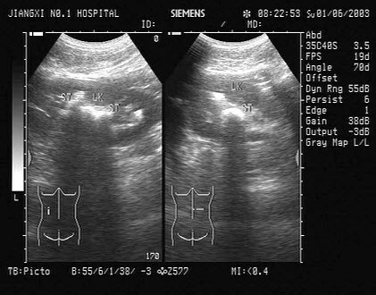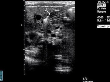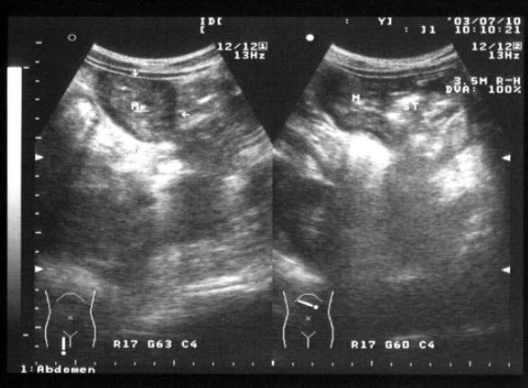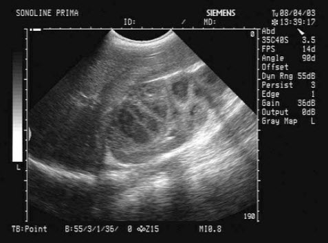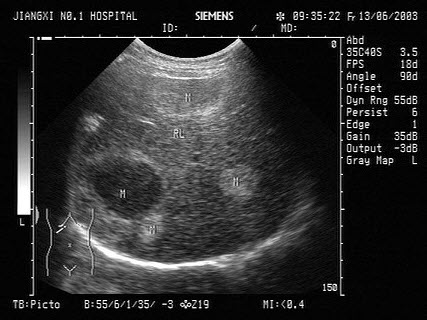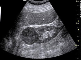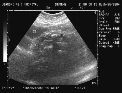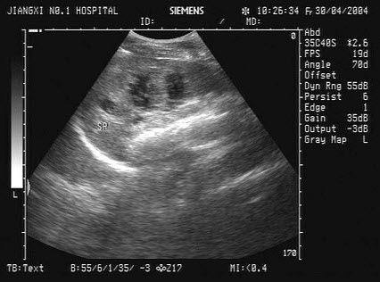 患者,消瘦,于左上腹触及一包块,超声见一大小5×7cm的呈假肾征的光团,如图所示,考虑为()