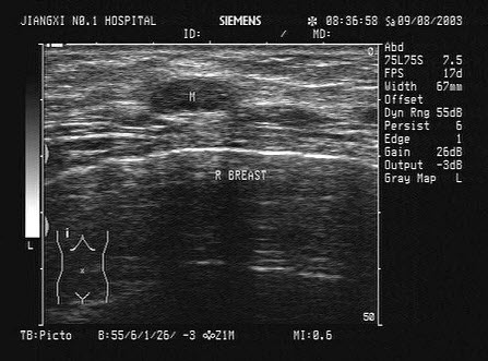 1、单项选择题 24岁女患者,发现右侧乳房硬性肿物1个月,无自觉疼痛.超声检查右乳外上象限椭圆形1.0cm×0.6cm肿物,边界光滑、整齐,内部均匀低回声,后方回声增强,有侧边声影,最可能的诊断是()