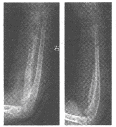 男,7岁,右前臂肿痛20天,发病时皮温较高,体温达39℃。实验室检查:WBC:12.05×109/L,中性粒细胞79%。右尺桡骨正侧位DR片如图