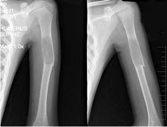 男,13岁,因轻微外伤后感左肱骨上部疼痛,软组织肿胀,摄片见左肱骨上段局限性骨质沿髓腔膨胀性破坏,骨皮质变薄,部分骨皮质不连续,最可能的诊断是()