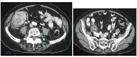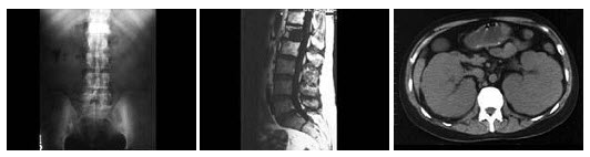 男,20岁,右腰部胀痛不适,MRI如图示,下列说法正确的是()