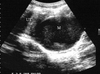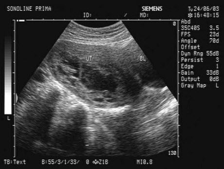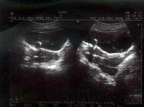 女性,于膀胱输尿管位置见一囊性光团,有规律收缩,增大。如图所示,考虑为()