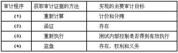 审计人员在对Z股份有限公司2013年度的财务报表进行审计,进行了下列审计程序:(1)抽样重新计算2013年度甲材料的计价是否正确;(2)资产负债表日后对大额应收账款进行函证;(3)按照Z公司内部控制规定的赊销审批手续独立执行该流程;(4)对Z公司库存现金进行监盘。要求:完成下表: