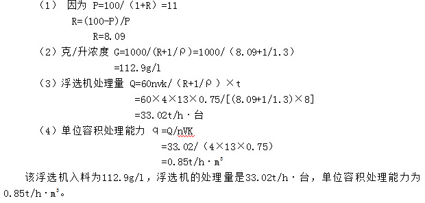 此台浮选机的处理量是88.07t/h·台,单位容积处理能力是1.57t/h·m3