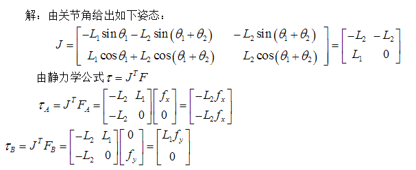 13、问答题 如图所示两自由度机械手在如图位置时(θ1=0,θ2=π/2),生成手爪力FA=[fx0]T或FB=[0fy]T。求对应的驱动力τA和τB。