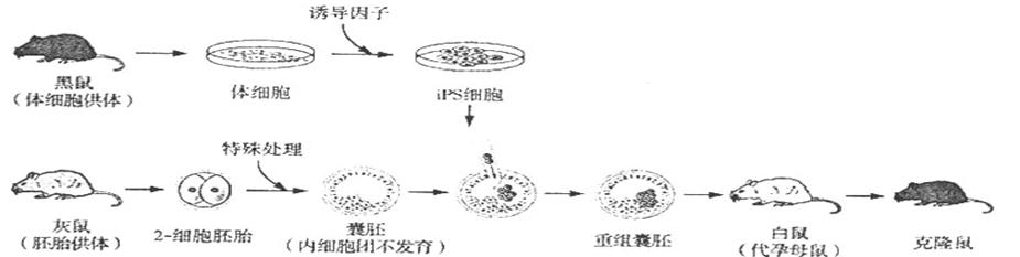 科学家通过诱导黑鼠体细胞去分化获得诱导性多能干细胞(iPS),继而利用iPS细胞培育出与黑鼠遗传特性相同的克隆鼠,流程如下: