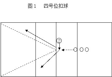 每个考生在四号位扣球共10次。要求扣直线球5次,扣斜线球5次(见图1)。副攻队员可选择在三号位扣半高球(见图2) |