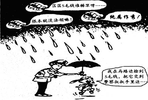 ⑴可从整幅漫画立意:一枚小小的5毛硬币,却引起了大风波。警察的做法体现了新的人本理念,硬币虽小,兹事体大,培育正气,正应该从小做起。
