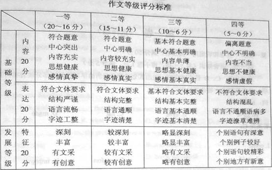 四、套作、文体不明确的适当扣分。抄袭的,“基础等级”在第四等之内评分,“发展等级”不给分。