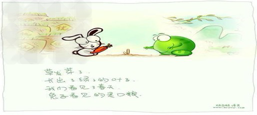 画中题语:春草发芽了,长出了绿绿的叶子。我们看见了春天,兔子看见的是口粮。