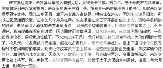 朱汉宾年轻时勇猛健壮,到晚年也酒量食量过人,体态仍旧很魁梧。凡是他担任职务的地方,没听说有逾越法度的事。在后梁的时候,曾经领兵驻扎在魏州莘县,恰好赶上连帅离开本郡,众军都用利益诱惑他,请求他自己担任留后,朱汉宾就杀掉说这些话的人,拒不听从,听说这件事的人都赞扬他。在曹州的时候,蝗虫飞离州境,父老乡亲讴歌赞颂他。掌管平阳的时候遇到旱灾,朱汉宾亲自斋戒沐浴到龙子祠祈雨,过了一天雨水充足,后来四境内取得了大丰收,人们都认为是他仁厚的政治感召的结果。等到退休的时候,向东回到亳州,看见乡里故友亲戚死去,有坟墓没建的,就送给他们棺木收殓埋葬;有结婚出嫁没完成的,就用钱财礼物帮助他们,接受他恩惠的有几百家,同郡的人认为他有德义。不久回到洛阳,有宅院在怀仁里,北到洛水,南临大道,高屋幢幢相连,大树枝叶相交,有吹笙唱歌的童儿,有身穿罗绮的舞女,天天以此自乐,颐养自然的和气,安享自己的晚年,这真是近代懂得知足的良将啊。晋高祖即位,追赠太子少傅官职,谥号为贞惠。