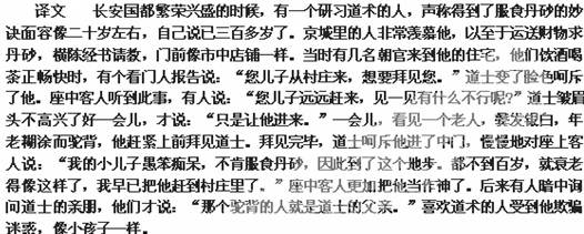 长安繁盛之时,有一道术人,称得丹砂之妙,颜为弱冠,自言三百余岁。京都人甚慕之。至于输货求丹,横经请益(横经,横陈经书。请益,指请教)者,门如市肆。时有朝士数人造其第,饮啜方酣,有阍者报曰:“郎君从庄上来,欲参觐。”道士作色叱之。坐客闻之,或曰:“贤郎远来,何妨一见?”道士颦蹙移时,乃曰:“但令入来。”俄见一老叟,鬓发如银,昏耄伛偻,趋前而拜。拜讫,叱入中门,徐谓坐客曰:“小儿愚騃(ái呆),不肯服食丹砂,以至于是。都未及百岁,枯槁如斯,常已斥于村墅间耳。”坐客愈更神之。后有人私诘道者亲知,乃云:“伛偻者即其父也。”好道术者受其诳惑,如斯婴孩矣。(王仁裕《玉堂闲话》)