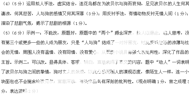 参考答案:(1)(3分)①波贝尔与德鲁若克形影不离,相依为命;②德鲁若克能倾听波贝尔诉说不幸的身世;③德鲁若克为主人之死哀嚎,寸步不离;④德鲁若克在主人的墓地悲痛忧伤至死。(写出一点给1分,写出其中三点即可) (2)(4分)交代时间,同时也说明春天来临,会给人带来希望(2分);推动情节发展,起反衬作用:春天的到来并没有给波贝尔带来希望,反而使波贝尔生活更加艰辛,生存状况更加不幸(2分)。 (3)(6分)孤苦伶仃,以狗儿为伴(2分);生活艰难,以乞讨为生(2分),被遗忘被冷落,是一个不为人所需的“多余者”形象(2分)。