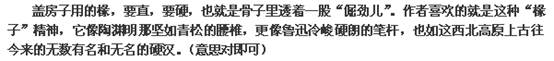 ⑥我的描绘如果就此结束,我知道,还是对不住它的。我还应该用我满腔的浓浓的墨汁,泼出它的名字。有人把它叫做塞上柳,有人把它叫做蓬头柳,有人把它叫做扛椽树。我特别喜欢最末这个名字,因为它摒弃了柔弱的柳字,更因为它以浓郁的泥土气息,道出了它的根本特质。那么,就让我在浓浓的墨汁中饱和上深厚的感情,像豪雨一样,痛畅地泼下它吧──扛椽树!泼下它的时候,应该再次泼下它的奇崛形象,那形象仿佛是黑桩子,黑碑石,黑煤垛,黑旋风,黑爆炸,黑白故事片中的黑脸黑衣传奇英雄,黑得使人过目难忘。这还不够,还应该泼出它黑色躯体中的代代相袭的遗传基因,以及由于这基因才一辈辈地、一年年地、永不歇息地扛着椽,扛着椽站起啊站起,献给父老兄弟姐妹,修筑广厦千万间。还应该泼出它的声音。那是负重的声音,那是拼争的声音。那是乐此不疲、坚忍不拔、不屈不挠、从来不说一个不字的声音。那是粗重的从胸膛发出来的喘气的声音。那声音如一股一股的西北风,风撼北国大野,壮我中华万世之威!?