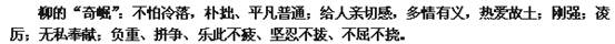 ③描绘它,没借鉴可寻。不论是关于柳的任何文字,都与它挂不上边。所以,什么蛾眉呀发丝呀的种种女儿气,应该首先在天地间扫荡净尽。不能有西施的影子。不能有林黛玉的影子。不能有刘三姐的影子。甚至京华柳的那种绿,江南柳的那种绿,灞柳中原柳的那种绿,在这里也可以忽略不计──只用黑。黑还要浓黑。于是,我把我周身的血液变成浓浓的墨汁,满腔满腔地往出泼。泼一柱疙疙瘩瘩的铁的桩子,泼一片铁的定格了的爆炸,泼一股爆炸了的力的冲击。或者,泼成曾经跃起在这儿的英雄:泼成蒙恬,泼成赫连勃勃,泼成李自成,泼成刘志丹和谢子长。也可以泼成这儿的无数死了的或者活着的普通刚强汉子。我还想把它泼成鲁迅。鲁迅虽是南方人,但他的骨头却像是这柳。我要泼出的是鲁迅的黑白木刻般的雄姿。——这就是柳。