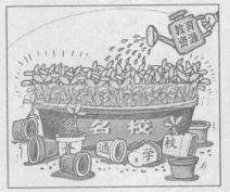 本题解析:漫画类题目需要考生自习观察漫画画面和文字,然后运用联想想象能力结合社会实际弄懂漫画表达的寓意,也就是设计者的创作意图。图中画面内容为有人正在用写有“教育资源”的水壶浇灌一大盆茂盛的写有“名校”二字的花卉,大花盆旁边有很多躺倒的写有“普通学校”的小花盆,盆内花朵很少甚至没有。此则漫画观察完画面和文字,很容易看出反映的社会现象是教育资源的不平衡,向名校倾斜,造成名校独大,普通学校越来越弱。解决办法当然是加速教育改革进程,推动教育均衡发展。