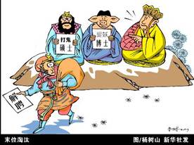 3、语言运用题 为右面这幅漫画拟一个标题,然后说一说漫画讽刺了怎样的社会现象。(4分)