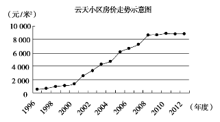 5、语言运用题 阅读右下角的图表,用简明的语言概述云天小区房价走势变化的基本特点,不使用具体数字(包括年份),含标点不超过35字。(3分)