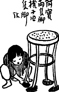 5、语言运用题 下面是丰子恺先生为女儿阿宝创作的一幅漫画《阿宝两只脚,凳子四只脚》,请根据以下要求各写一段文字。 (1)简要介绍画面的内容。
