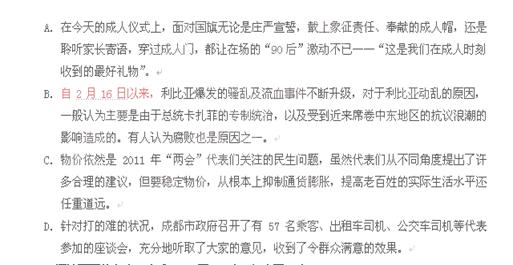 参考答案:C.(A.项语序不当,“无论是”应移至“面对国旗”前面;B.