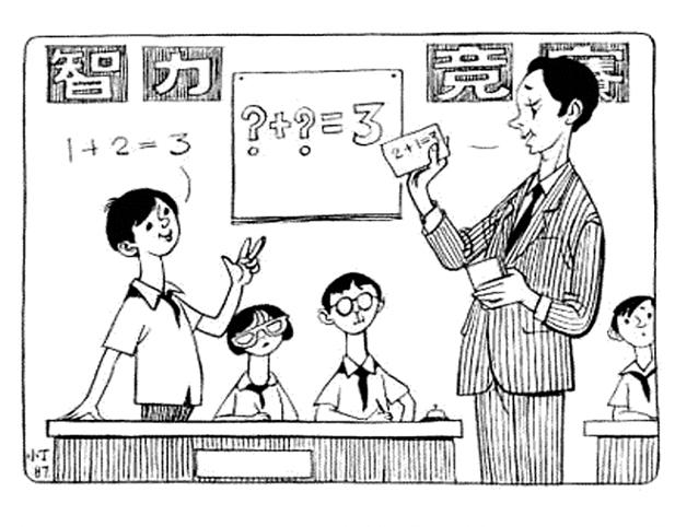 本题解析:这幅漫画名为“智力竞赛”,按说应是真正考察学生的灵活反应能力,但画面上告诉我们的却是:老师认为等义3的答案只能是2+1,学生回答的1+2=3算错误。因此以这幅漫画作文的主旨就很明确了:要培养学生的灵活反应能力,必须允许学生有创新意识,因为有些问题的答案确实是丰富多彩的。