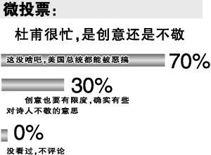 成都杜甫草堂博物馆在官方微博转发“杜甫很忙”时,附一首韩愈的《调张籍》的诗来表达对网友的不满。记者了解到,其实“繁忙地”不仅仅是杜甫一个人,李白、辛弃疾及一些外国名人画像都曾被学生拿来涂改,还有网友上传了“李白不服气了”等系列图片。本报微博昨日发起了“杜甫很忙,是创意还是不敬”的投票。有三成网友认为,创意也要有限度,不能对名人不敬。