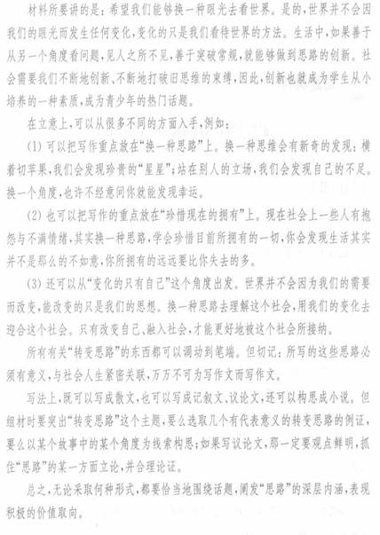 本题解析:“阅读”这个话题与我们的生活实际联系最为紧密,也能直接体现我们的语文素养,可以说是一个比较好写的题目。作文材料比较长,可概括为两个方面,一是“阅读”的内容,只提到文学作品,一是阅读的作用,主要是陶冶情操,启迪思想。一般而言,话题作文只要与话题有关,不脱离话题的范围,都不算离题,但这决不意味着材料对话题没有限制作用。无论是巴金的话,还是命题者的解释,或是作文要求“可以写一段关于阅读的故事,可以写自己阅读时的领悟,也可以写自己对读物的认识”来看,这里的“阅读”,都是指读书,而读书又是我们人人都有话可说的话题,所以,完全没有必要冒着偏离题意的风险,去写阅读自然,阅读人生。