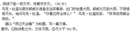 要求:①自选角度,自定立意,自拟标题,自选文体;②不要脱离材料的含意,不得套作,不得抄袭;③用规范汉字书写;④不少于800字。