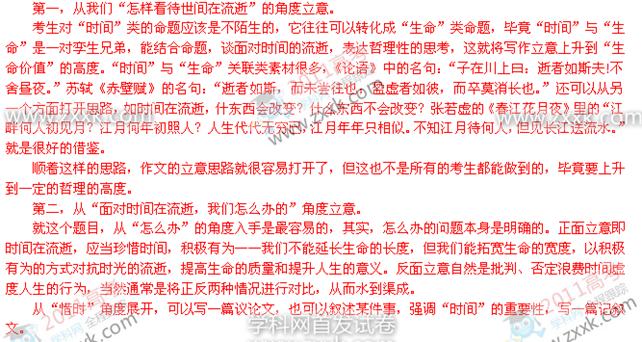 其实,该题目最为关键的词语应该是“在”,这里的“在”是个副词,作状语,是“正在”的意思。题目的意思就是“时间正在像流水一样从我们的面前消失了”,“正在”表示一种状态,是进行时态。扣住“正在流逝”,大的方面可以从下面两个角度立意。