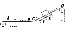 ,AB段和CD段通过极短的BC段平滑连接.现将大量的质量均为m的小货箱一个一个在A处放到传送带上,放置时初速为零,经传送带运送到D处,D和A的高度差为h.稳定工作时传送带速度保持不变,始终为v,CD段上各箱等距排列,相邻两箱的距离为L.每个箱子在A处投放后,在到达B之前已经相对于传送带静止,且以后也不再滑动(忽略经BC段时的微小滑动).传送带由电动机带动,传送带与轮子间无相对滑动,不计轮轴处的摩擦.