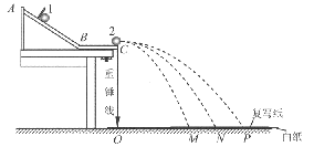 3、实验题 某同学用如图所示的装置,通过半径相同的两球碰撞来验证动量守恒定律。图中AB是斜槽, BC是水平槽,斜槽与水平槽之间平滑连接。实验时先使球1从斜槽上某一固定位置由静止开始滚下,落到位于水平地面的记录纸上,留下痕迹,重复上述操作10次。再把球2放在水平槽末端的位置,让球1仍从原位置由静止开始滚下,与球2碰撞后,两球分别在记录纸上留下各自的落点痕迹,重复上述操作10次。在记录纸上确定M、N、P为三个落点的平均位置。实验中测出球1的质量为m,球2的质量为m