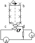 1、填空题 如图所示,一交流发电机线圈共50匝,ab=0.1m,bd=0.2m,总电阻为10Ω,在B=0.5T的匀强磁场中从磁通量最大位置开始以100r/s的转速匀速转动,外电路中接有R为40Ω的电阻,当线圈转过