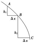 2、填空题 做物体平抛运动的实验时,只画出了如图所示的一部分曲线,在曲线上取A、B、C三点,测得它们的水平距离均为Δx=0.2 m,竖直距离h1=0.1 m,h2=0.2 m,试由图示求出平抛物体的初速度v0=?m/s,平抛原点距A的水平距离为x=?m(g取10 m/s2).
