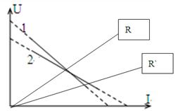 本题解析:将一电动势为E、内电阻为r的电源与一阻值为R的电阻组成一闭合回路,路端电压U和干路电流I的关系为U=E-Ir.在U-I直角坐标系中作U-I图线,则该图线为一条在纵轴上截距为E、斜率为-r的直线.这条线可被称为电源的伏安特性曲线.如果再在此坐标系中作出外电阻R的伏安特性曲线为过原点的直线,斜率为R,则两条线的交点就表示了该闭合电路所工作的状态,此交点的横、纵坐标的乘积即为外电阻所消耗的功率.依题意作电池甲和乙及电阻R的伏安特性曲线.由于两电池分别接R时,R消耗的电功率相等,故这三条线必相交于一点,如图所示,由于α1>α2,所以r1>r2.
