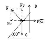 4、计算题 如图所示,在与水平方向成60°的光滑金属导轨间连一电源,在相距1m的平行导轨上放一重力为3N的金属棒ab,棒上通以3A的电流,磁场方向竖直向上,这时棒恰好静止。求:(1)ab棒对导轨的压力;(2)匀强磁场的磁感应强度B。
